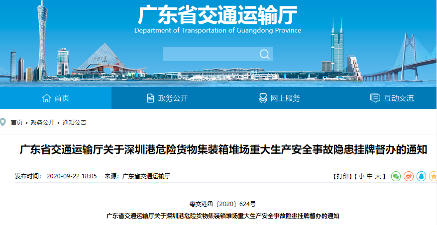 广东省交通运输厅关于深圳港危险货物集装箱堆场重大生产安全事故隐患挂牌督办的通知
