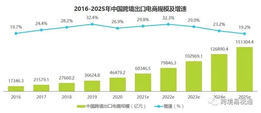 近年来,我国跨境出口产品向更大量级、更多品类、更高客单价发展。2020 年,我国跨境电商出口市场规模达到4.65万亿,同比增速26.9%,据预测,到2025年规模会达到15.1万亿,且接下来四年符合增速26.6%。