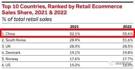 来自eMarketer的数据,预测2021年中国电商将占52.1%的零售额,高于上一年的44.8%,中国电商仍旧稳居第一。排名第二的是韩国,预计今年韩国的网上交易额将占其销售额的28.9%。在美国,这一数字将仅为15.0%,西欧国家平均达到12.8%。