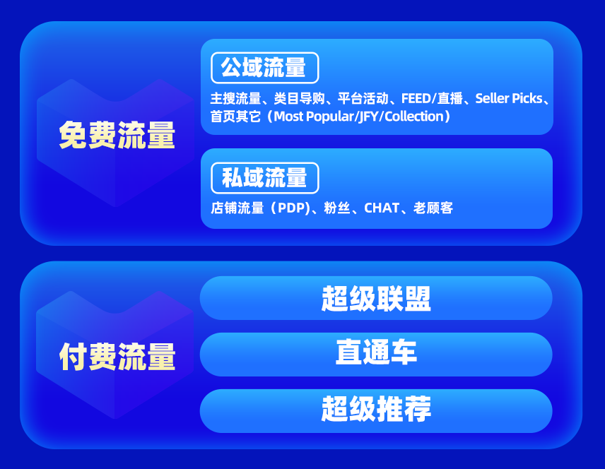 商家可以通过主搜流量、类目导购、平台活动等平台渠道获取免费流量,也可利用超级联盟、直通车、超级推荐等付费渠道,扩大店铺私域流量池。之后通过优惠券、多件多折、包邮等组合玩法吸引顾客下单,提高转化率。