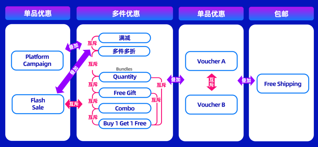 Lazada商家优惠包含单品优惠、多件优惠、优惠券、包邮4种类型,多种优惠可在同一个订单可以进行平行叠加,需要注意的是,玩法虽多,但有些会互斥,商家要择优选取。