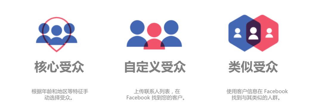 3、拆解受众。在Facebook中有三大受众定位方式,每种都有相对应的人群。商家可以根据不同的用户画像来进行受众的抉择。