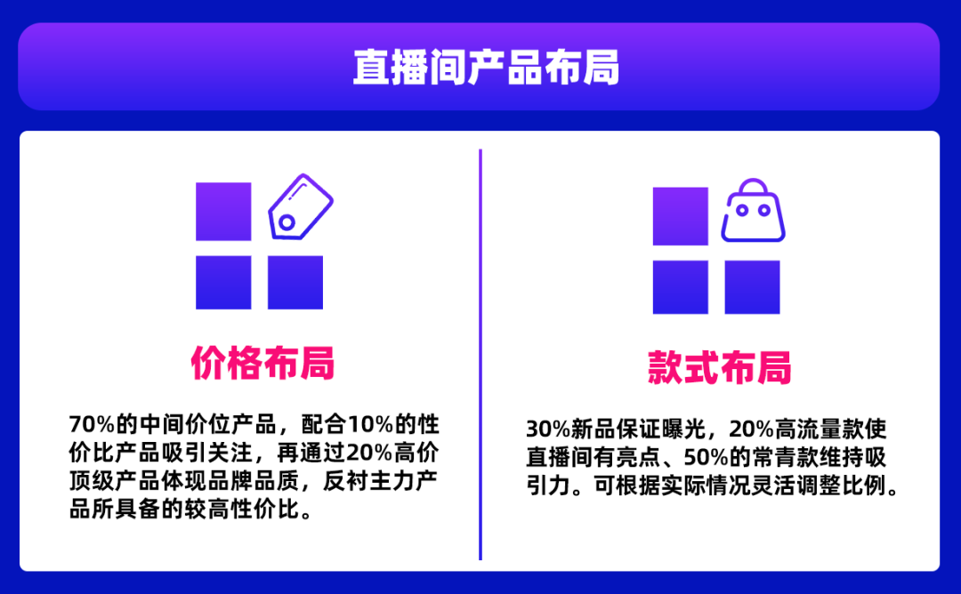 由于直播时长较长,在什么时间段放哪个等级产品的节奏和策略显得尤为重要。对此,我们可以利用直播间产品布局,来提升直播间的节奏和趣味性。一方面,通过设计合理的价格阶层,凸显性价比高的产品,拉高粉丝的心理期待。另一方面,以齐全的品类,满足消费者差异化需求,将粉丝留驻的周期拉长。