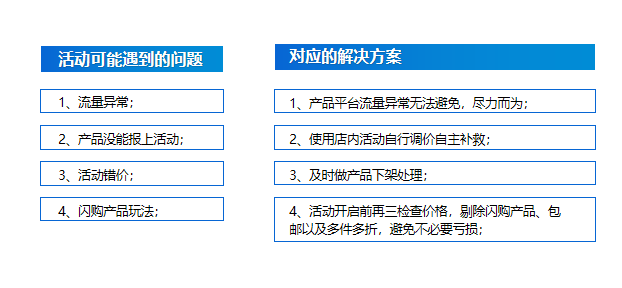 5、针对在活动中可能出现流量异常、活动报名不成功、错价、闪购玩法等问题,对应的解决方案来了。