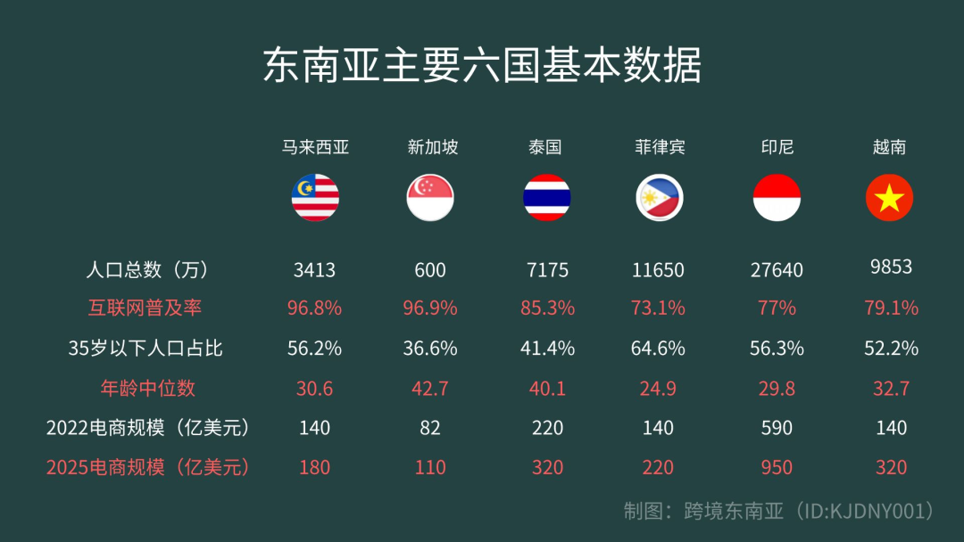 进入 2023 年,该地区主要六国(马来西亚、新加坡、泰国、菲律宾、越南、印度尼西亚)的人口、年龄分布、互联网用户、电商发展有没有什么变化呢?今天,我们一起看看。