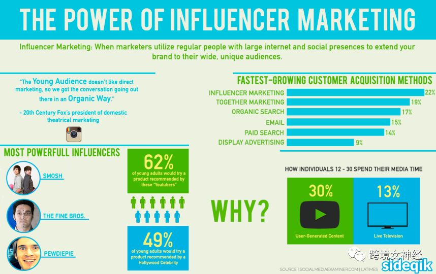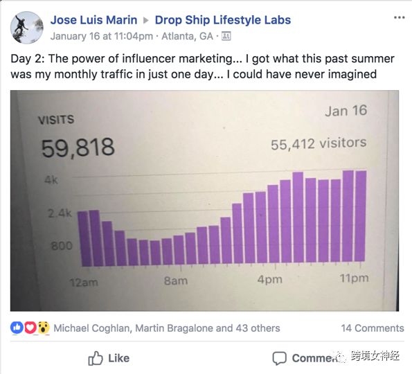 这个是我在Facebook上看到的一则分享,暂不论数据真实性与否,就红人营销的即时性趋势还是很不错的。这个就好比是红人某一天发布了与你品牌相关的内容,当天就立马能引入不少流量,跟之前的流量呈几倍式增长。