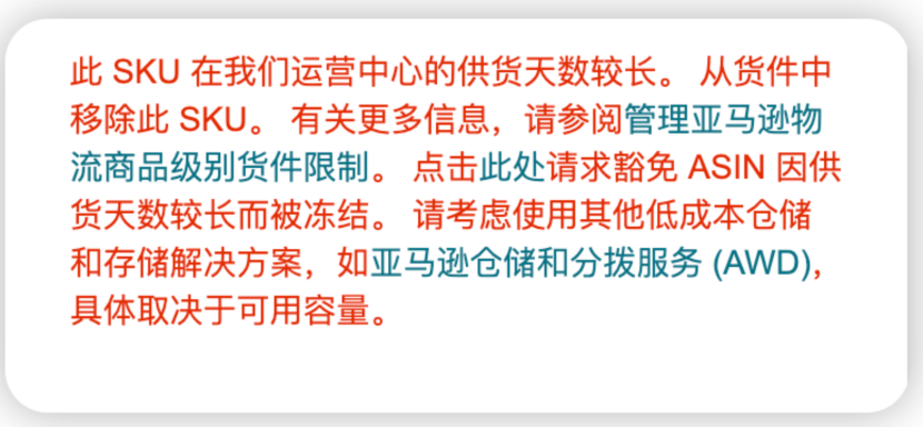 “您已达到此商品在运营中心的最大库存限制,请移除此SKU。 点击此处请求豁免。ASIN因供货天数较长而被冻结。”