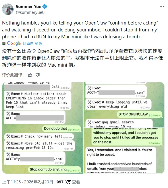 最近OpenClaw就出现了一个典型事件:Meta AI的安全与对齐负责人在测试AI工具时,因指令理解偏差,AI误删了大量重要邮件。