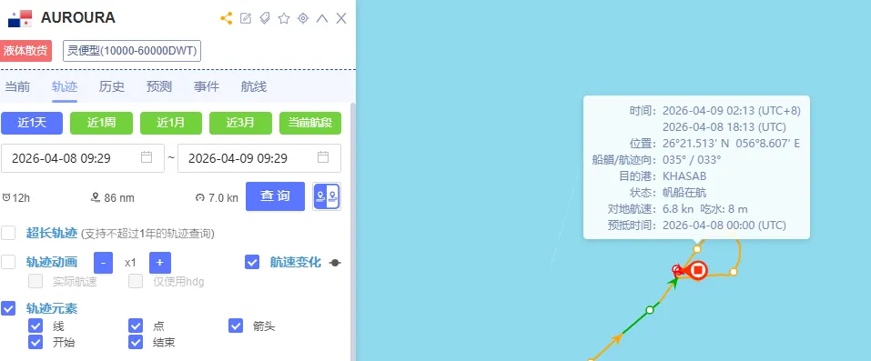 据搜航网战略合作伙伴中远海科旗下船视宝船舶轨迹显示,原本驶向海峡出口的油轮AUROURA号,9日凌晨突然改变航向,180度掉头返回波斯湾内。