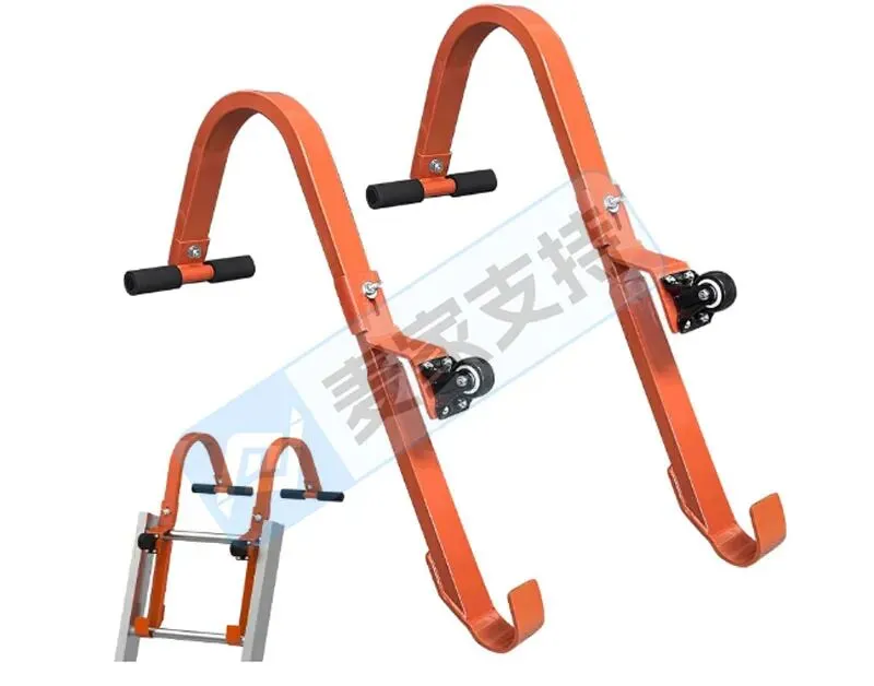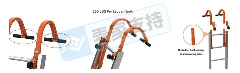 梯顶挂钩采用高强度矩形钢管制造,并考虑到由于不同梯子梯级间距的差异,而设计有四个安装孔,便于用户可根据实际使用的梯子情况,灵活选择合适的安装孔进行安装使用;万向轮设计便于使梯子更容易滑入屋顶,为屋顶作业省时省力;锁扣式梯子夹设计则可以有效将钩子套在梯顶横档并钩于屋顶边缘,双重固定防晃动,提升安全性,是屋顶作业的安全之选。