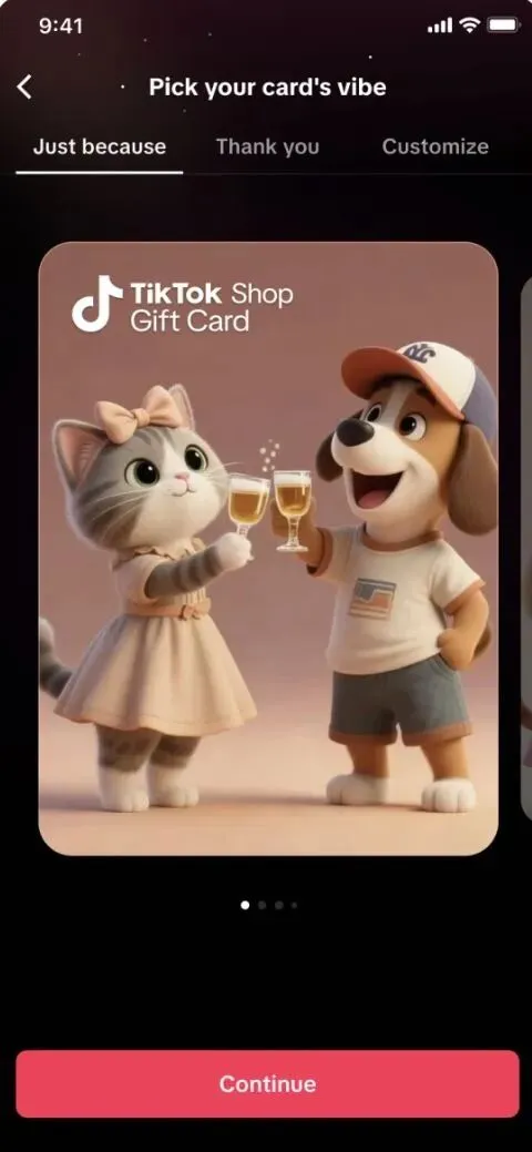 这次TikTok Shop上线的礼品卡,面额为$10 – $500,可定制设计,并能做成动态感谢卡,适用于生日、婚礼、节日、纪念日等场景。礼品卡用邮件即时送达,金额可直接充值到 TikTok的账户余额,收礼人可发送感谢留言,甚至可以“再转赠”。