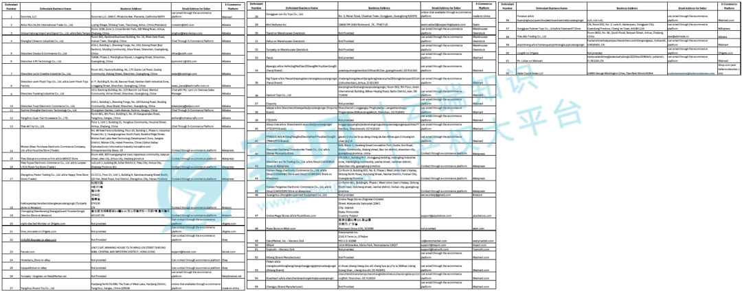 GBI 指控的62名被告(包括电商卖家、制造商、批发商等)存在知识产权侵权行为,具体表现为被告销售的假冒 Gummy Bear 毛绒玩具(“Counterfeit Products”)在外观上与 GBI 受商标保护的 Gummy Bear 角色几乎一致,且内置播放受版权保护的《Gummy Bear Song》的 37 秒盗版音频。