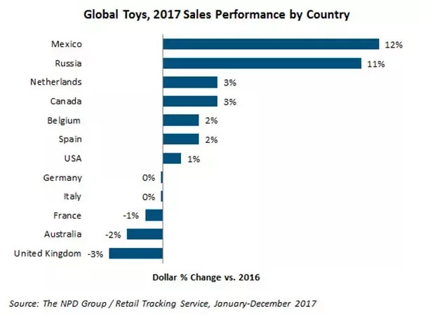NPD集团2017年对12个国家玩具行业销售增长做了统计:
