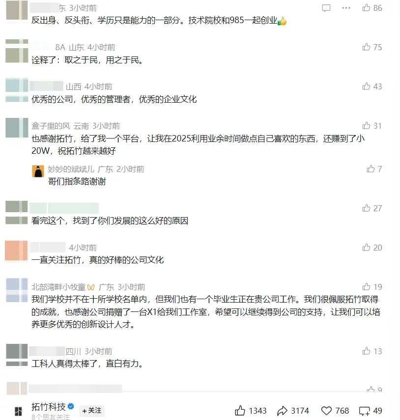在这样的背景下,拓竹向员工母校捐赠1亿元,本质上是一种表态:公司愿意为人才体系持续付出成本,也在为未来的人才供给提前下注。