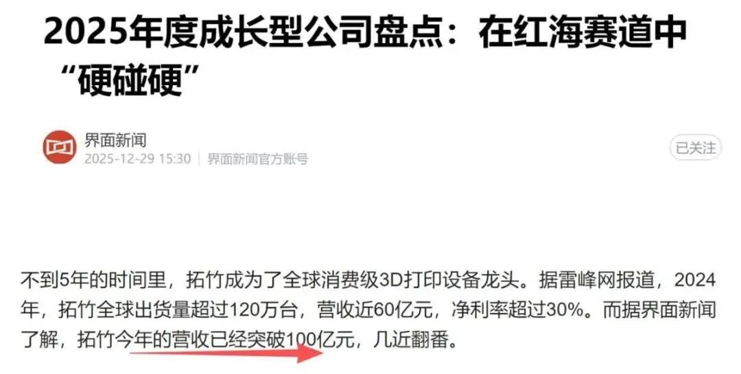 2024年,营收翻倍至60亿元,净利润逼近20亿元,全球出货量突破120万台,占据消费级3D打印市场29%的份额;