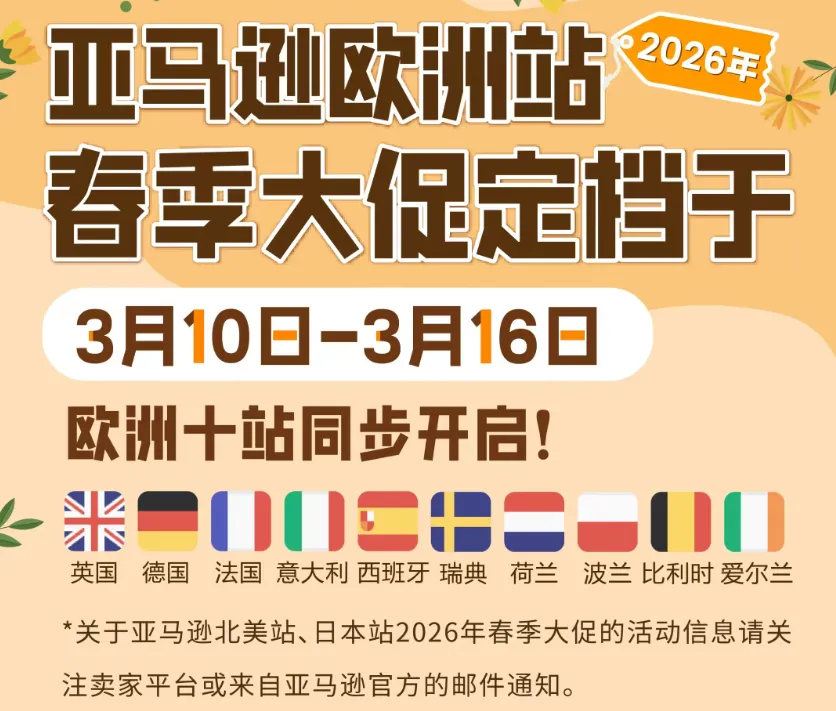 1月22日,亚马逊全球开店宣布欧洲十大站点春季大促于3月10日-3月16日开启,覆盖英国、德国、法国、意大利、西班牙、瑞典、荷兰、波兰、比利时、 爱尔兰。