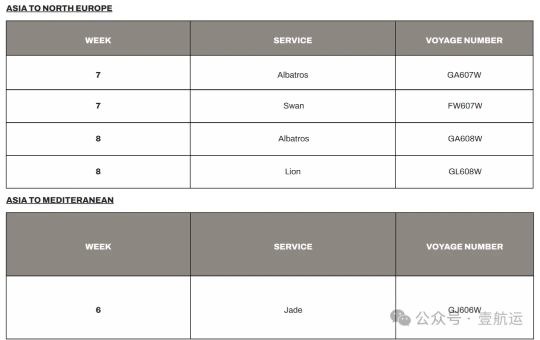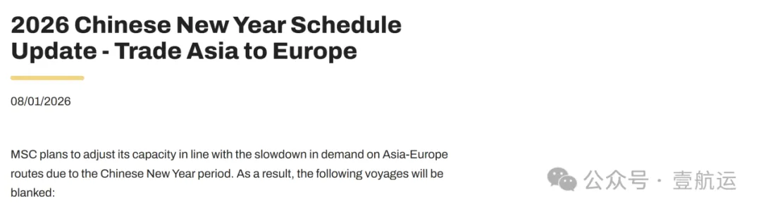 如MSC计划根据中国新年期间亚洲-欧洲航线需求放缓调整运力。因此,以下航次将被停航: