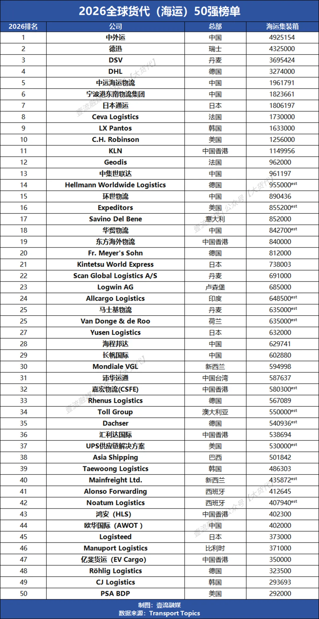 近日,由北美物流协会旗下出版的全球物流业权威杂志《Transport Topics》,更新了2026年全球海运货代50强榜单。