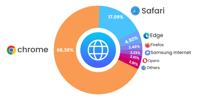 谷歌的市场主导地位源于其深度整合且自我强化的生态系统,Chrome 浏览器是核心环节。目前,Chrome 占据全球 65% 至 68% 的市场份额,拥有超过 34.5 亿活跃用户,在桌面和移动市场均占据绝对优势。
