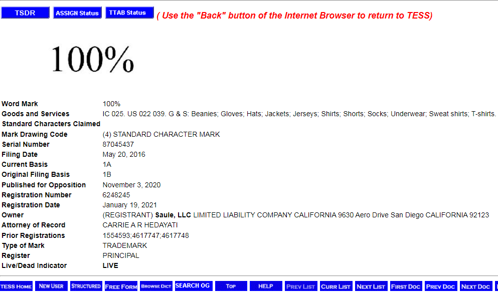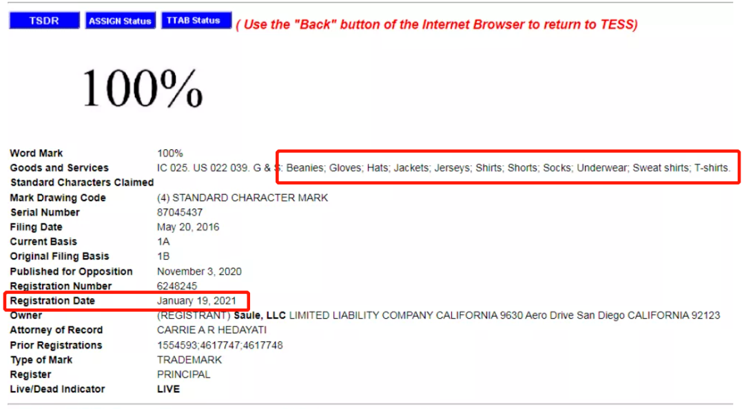 据小熙了解,100%商标是由赛车运动装备厂商注册的,属于美国公司Saule, LLC.旗下的产品。