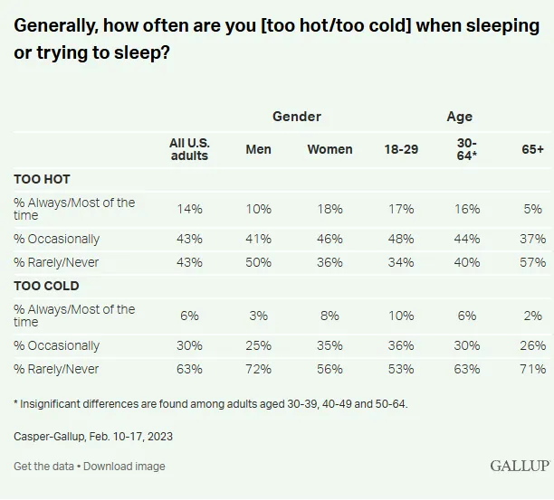 在美国南部、西部等炎热地区,夜间盗汗、睡眠闷热是普遍存在的睡眠障碍,而这恰恰是当时中低端床垫市场的空白地带。Gallup 2023 年调研显示,57% 的美国成年人至少偶尔会在睡觉时觉得太热;2025 年两大国际顶刊研究也证实,气温升高会持续损害睡眠时长与质量。