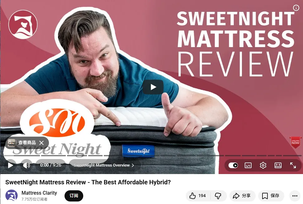 双方合作的《SweetNight Mattress Review - The Best Affordable Hybrid?》测评视频,全程摒弃硬广套路,沿用频道经典的 “结构拆解 + 实测体验 + 人群匹配 + 优缺点总结” 硬核逻辑,只围绕用户最关心的 “值不值得买” 展开深度说服。内容从床垫内部结构、多睡姿实测体验到购买政策全维度覆盖,形成完整决策闭环;同时不回避产品短板,直言其不适合纯侧睡人群、抗干扰性表现一般,反而大幅强化了内容可信度。