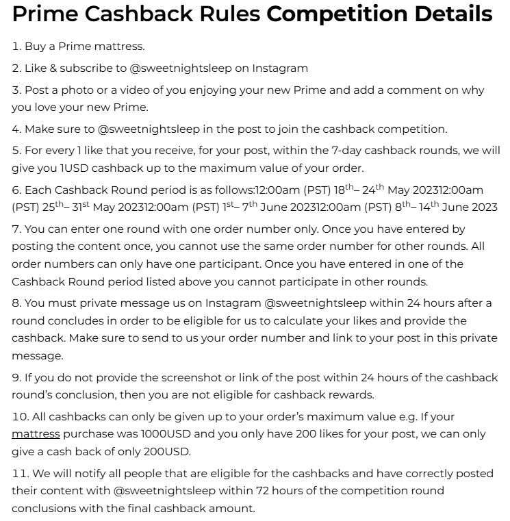 品牌甚至推出过极具裂变效果的玩法:购买 Prime 床垫的用户,在 Ins 发布相关内容,7 天内每获得 1 个点赞即可返现 1 美元,最高可返至订单全额,彻底点燃了用户的创作与传播热情;