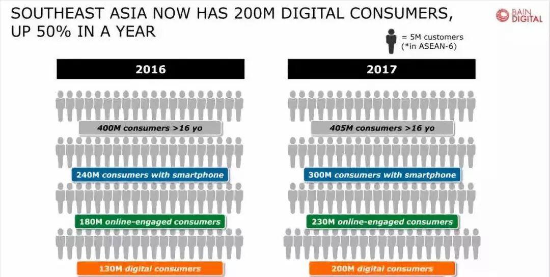 整个东南亚地区有6亿人口,但目前东南亚的网络零售占比仅为1%。2017年9月,全球咨询管理公司Bain&Company公布了一份东南亚主要6国数字经济报告。报告指出,东南亚六国16岁以上消费者有4.05亿;约有2亿数字消费者(即在线购买过产品或服务),较2016年增长50%。