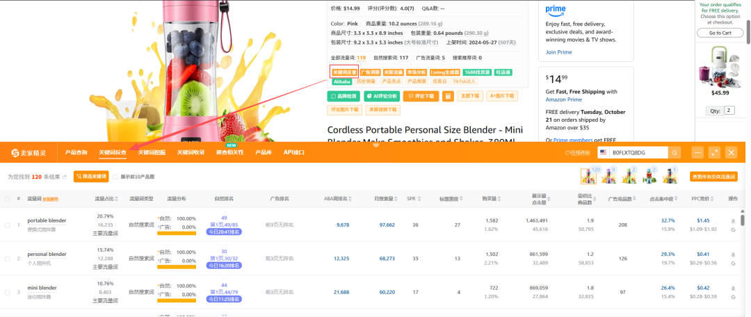 第二步,打开卖家精灵插件,点“关键词反查”。这时候你会看到他所有流量词,别急,大部分都是垃圾。
