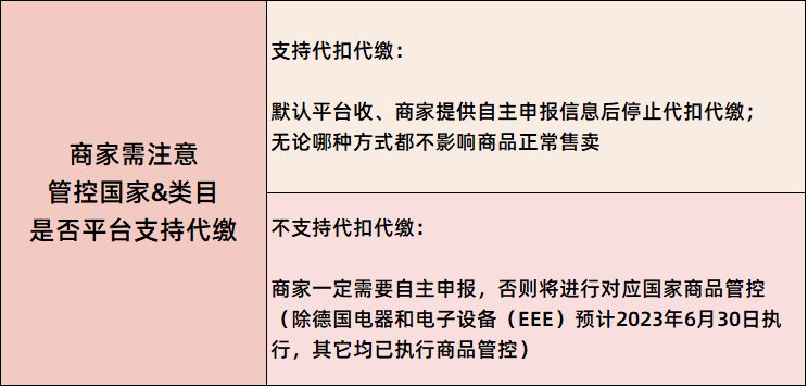 部分国家/类目,如德国及奥地利,当地法规不允许进行代扣代缴,商家需要在管控时间内自主申报,否则将会影响商品在对应管控国家的正常销售,商家们需要尤其关注。