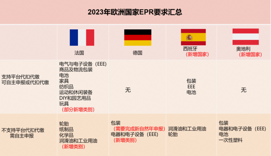 2022年已经远去,2023年蓄势待发。在欧洲做生意的跨境商家需要注意了!2023年欧洲4国新增了EPR合规要求,目前德国、法国、西班牙、奥地利已经开始执行EPR相关政策。所有在平台上售卖的商家,如销售商品到上述对应国家,均需要完成相应的EPR合规要求。