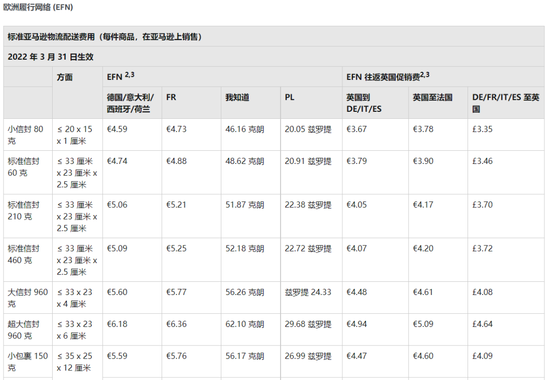 亚马逊表示:“从 2022 年 3 月 31 日开始,我们在亚马逊欧洲商店中不同计划的配送费用将发生变化。为帮助您在英国脱欧后在欧盟和英国之间进行销售,我们将为从欧盟(德国、法国、意大利和西班牙)到英国(反之亦然)的欧洲配送网络 (EFN) 费用提供 20% 的折扣,促销期为一个年,从 2022 年 3 月 31 日开始。”