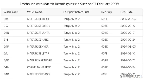 2026年1月10日从北查尔斯顿港出发的“马士基·底特律”号602E航次将是首个采用跨苏伊士运河航线的东行航次,此后所有航次均将遵循此航线。
