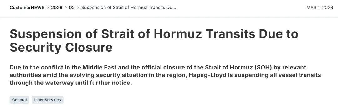 赫伯罗特(Hapag-Lloyd): 3月1日发布公告,确认因安全封锁暂停所有船舶通过霍尔木兹海峡,直至另行通知。公司表示正密切关注局势,受此影响,挂靠阿拉伯湾港口的服务将面临延误、改道或船期调整。