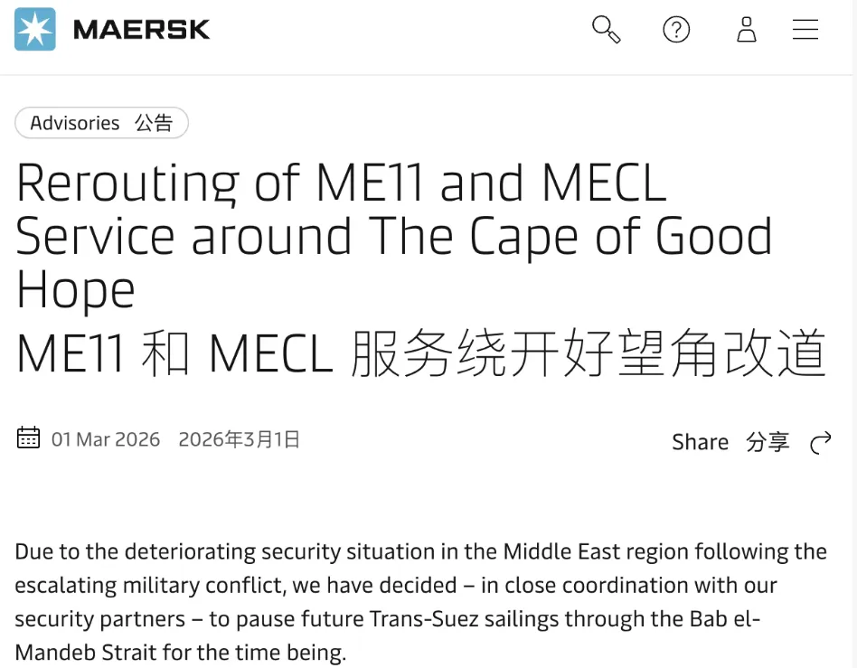 马士基(Maersk): 同样在28日宣布,将其ME11和MECL航线的部分班次从苏伊士运河改道至好望角, citing红海地区运营环境带来的不可预见限制。