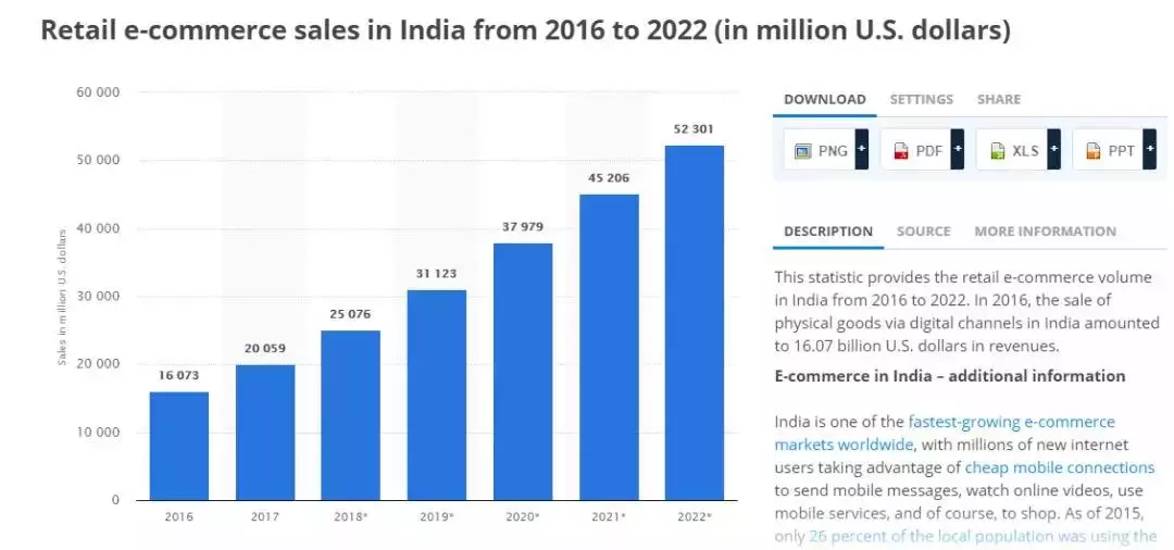 Statista数据显示,今年印度电子商务市场规模相比将去年增长25%,预计2022年将达500亿的市场份额。