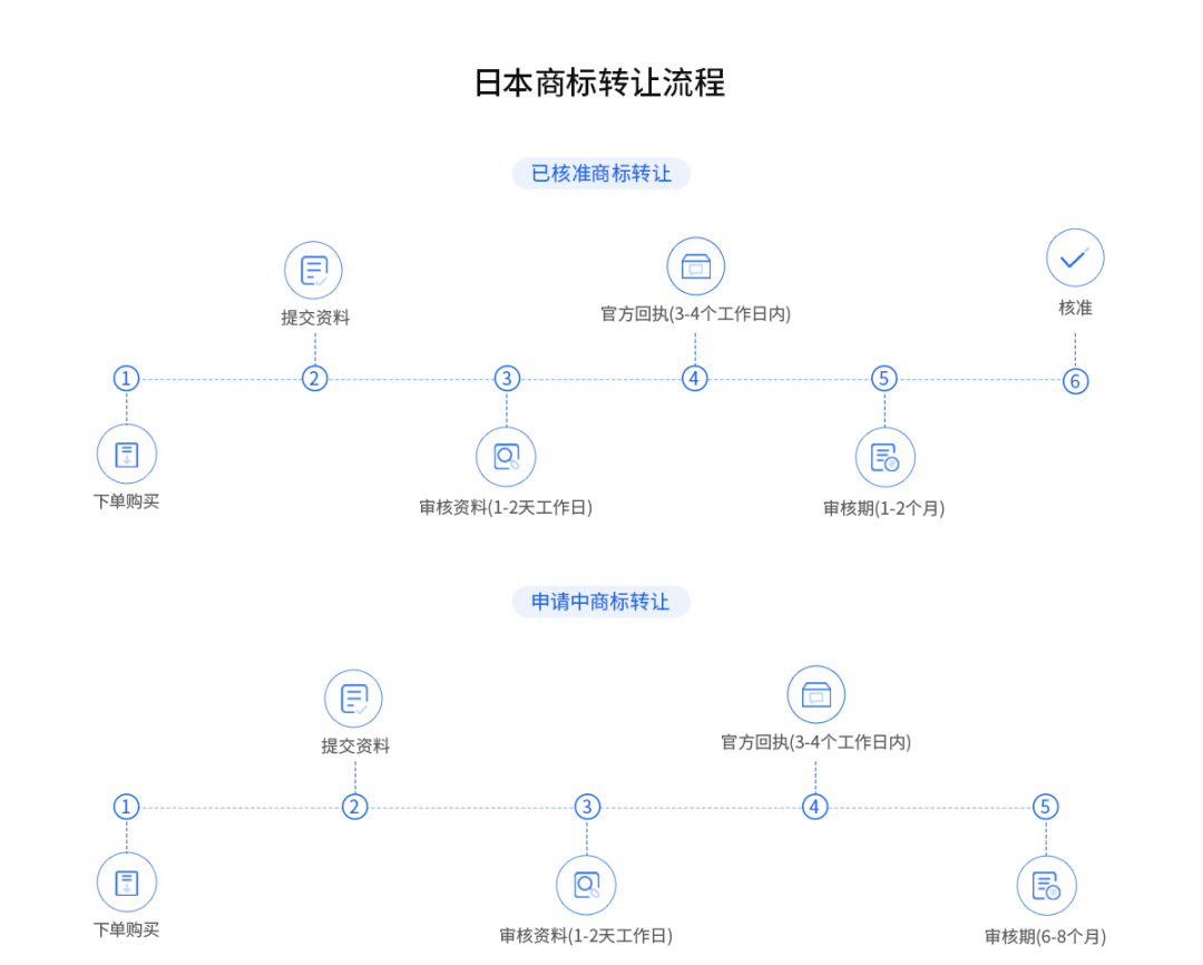 2. 日本商标已核准转让官方审核时效:1-2个月,申请中商标转让官方审核时效:6-8个月。