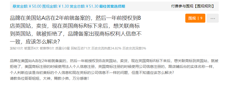 “品牌在美国站A店在2年前就备案的,然后一年前授权到B店英国站,卖货,现在英国商标R标下来后,想关联商标到英国站,就被拒绝了,品牌备案出现商标权利人信息不一致,应该怎么解决?”