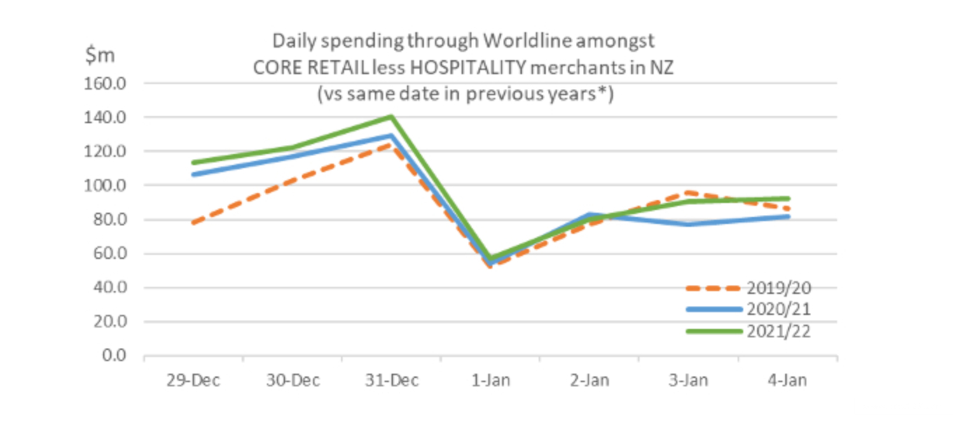 从2021年12月29至2022年1月4日这一周,新西兰人疯狂囤货,Worldline NZ支付网络记载了新西兰人网购支出了6.96亿美元,同比去年增加了7%,比2019年增加了13%。