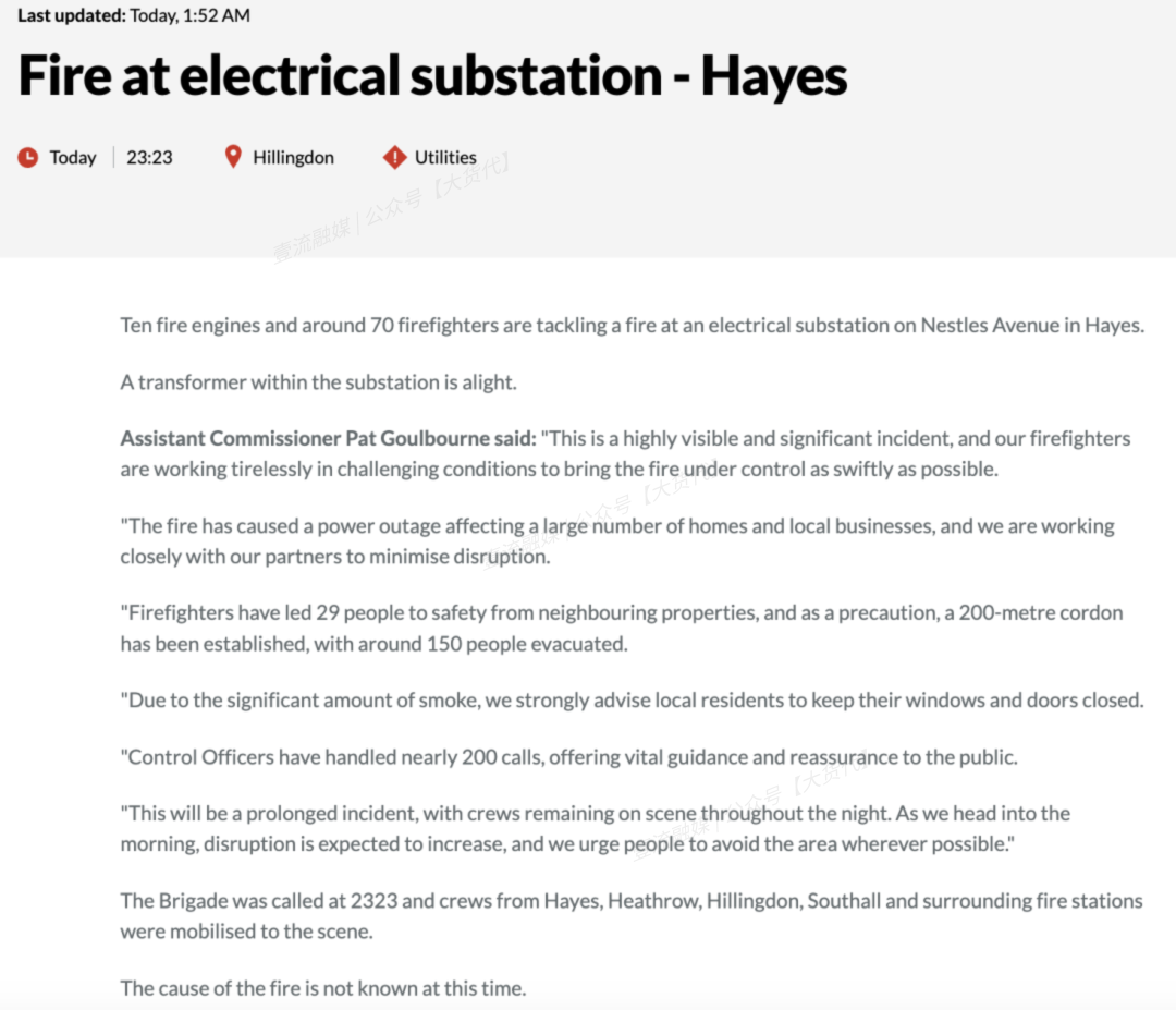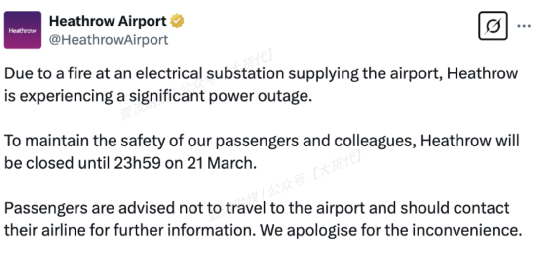 导致希思罗机场关闭的原因是给机场供电的变电站发生火灾,进而导致机场陷入严重的电力故障情况中。