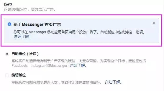 广告版位建议选择自动版位;实际上,Click-to-Messenger广告目前仅可展示在Facebook Feed、Instagram Feed和Messenger Home三种版位。