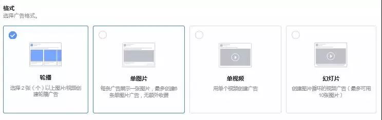 Click-to-Messenger广告目前支持轮播、单图、单视频和幻灯片四种形式。
