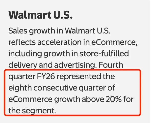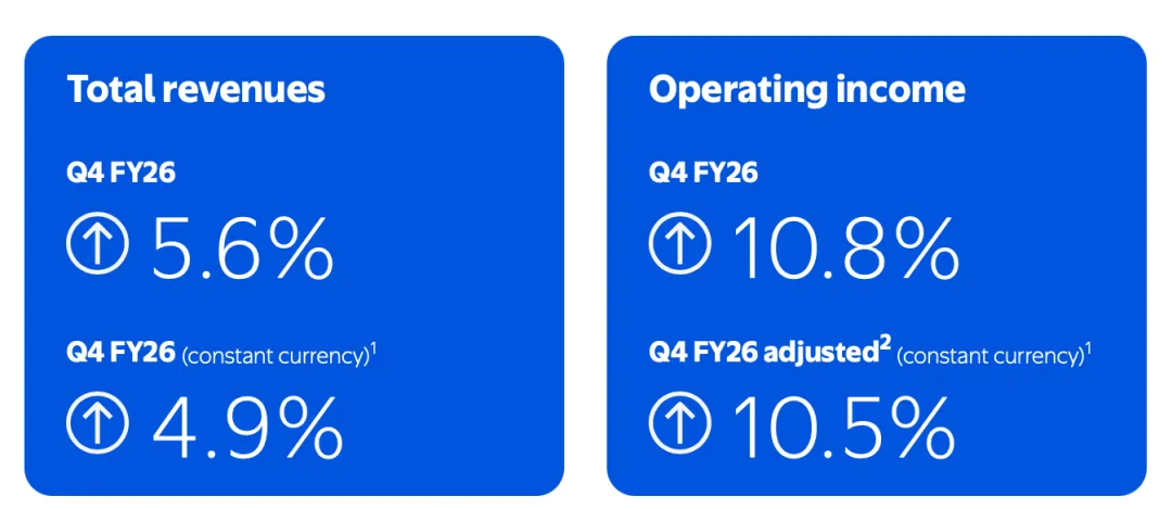 大象会跳舞!万亿市值的沃尔玛,在2026财年四季度,营业利润超预期上涨10.5%,标志着沃尔玛从传统零售商向科技驱动型企业的成功转型。沃尔玛在2026财年第四季度取得了强劲的业绩,实现营业收入1,907亿美元,同比增长5.6%;第四季度调整后营业利润为86亿美元,同比增长10.5%。