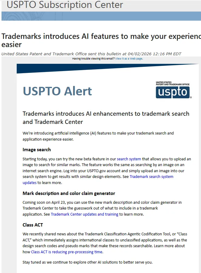 美国时间4月2日,美国专利商标局发布通知,宣布推出商标检索及商标中心人工智能升级功能。