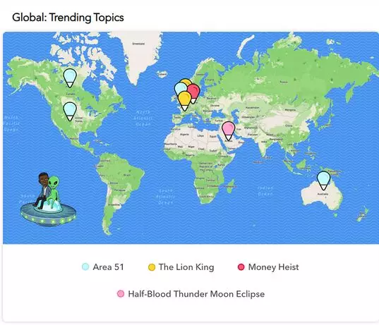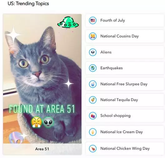 其中,被好莱坞如《独立日》以及《X档案》等大片“捧红”的美国神秘军事区-51区,迪士尼最新电影狮子王,热门美剧纸牌屋,以及奇特的月食奇观“超级血月”是7月份Snapchat上的大热话题~