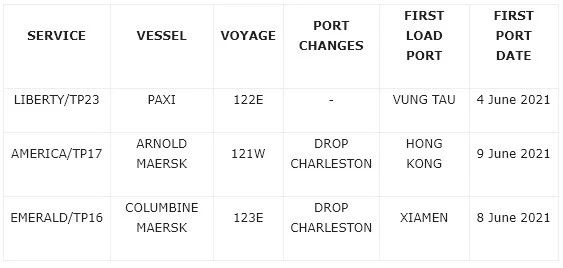 另外由于运营限制,马士基宣布将TP23航线的首艘航行推迟一周至6月6日。将在现有网络上提供预订。此外,还将延迟TP16和TP17,请参阅以下经修订的新有效航行的信息。