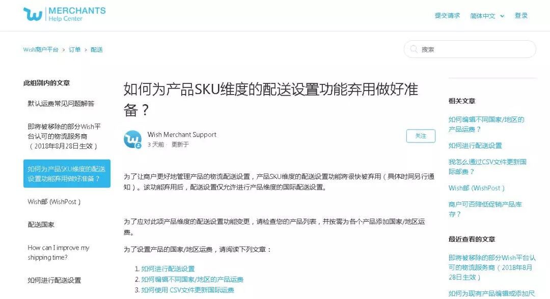 Wish商户平台消息:9月17日起,产品SKU维度配送设置功能弃用,新功能将采用商户维度的配送设置。而从7月3日0时(世界标准时间)开始,如果产品已在“国际运费设置”内为某些国家/地区单独设置过运费,商户将无法使其变更为“使用产品运费”。