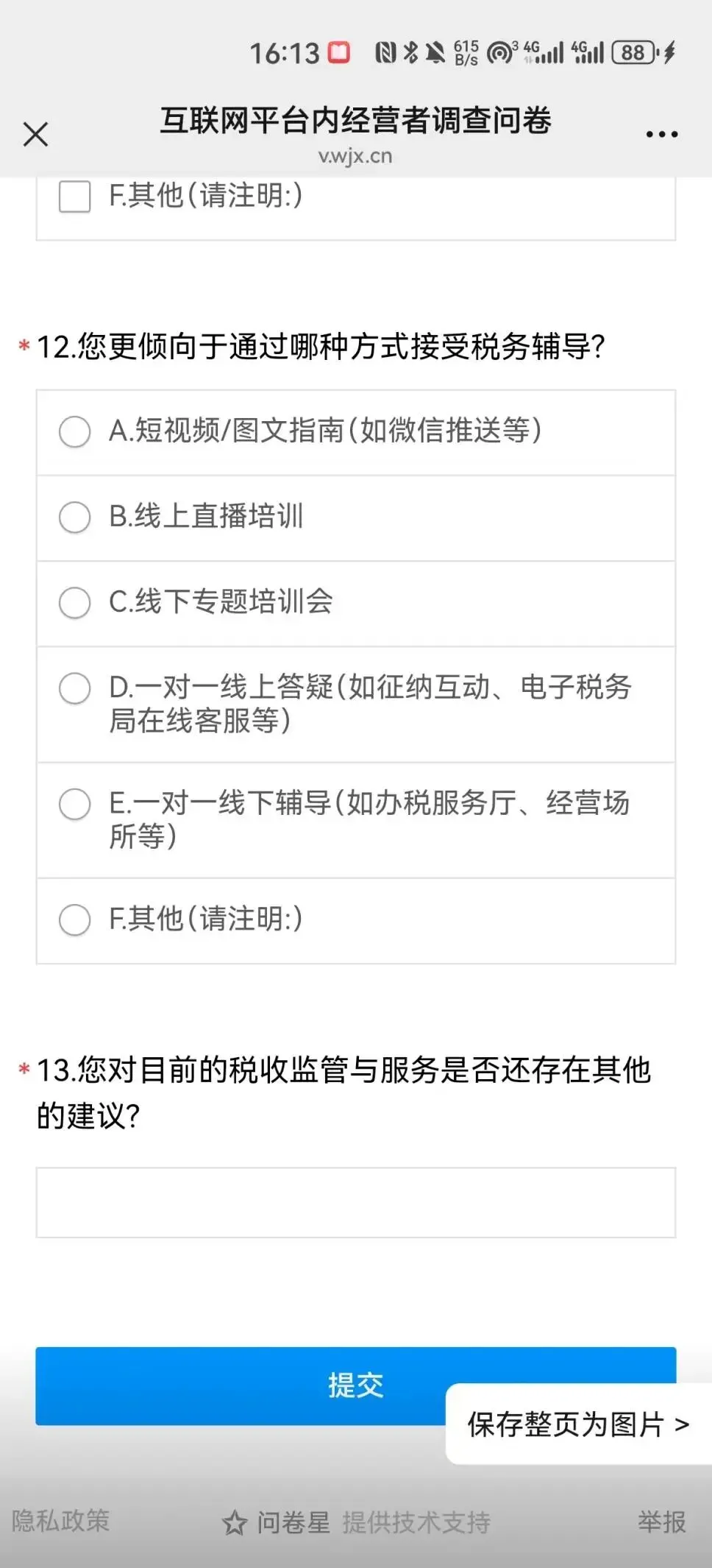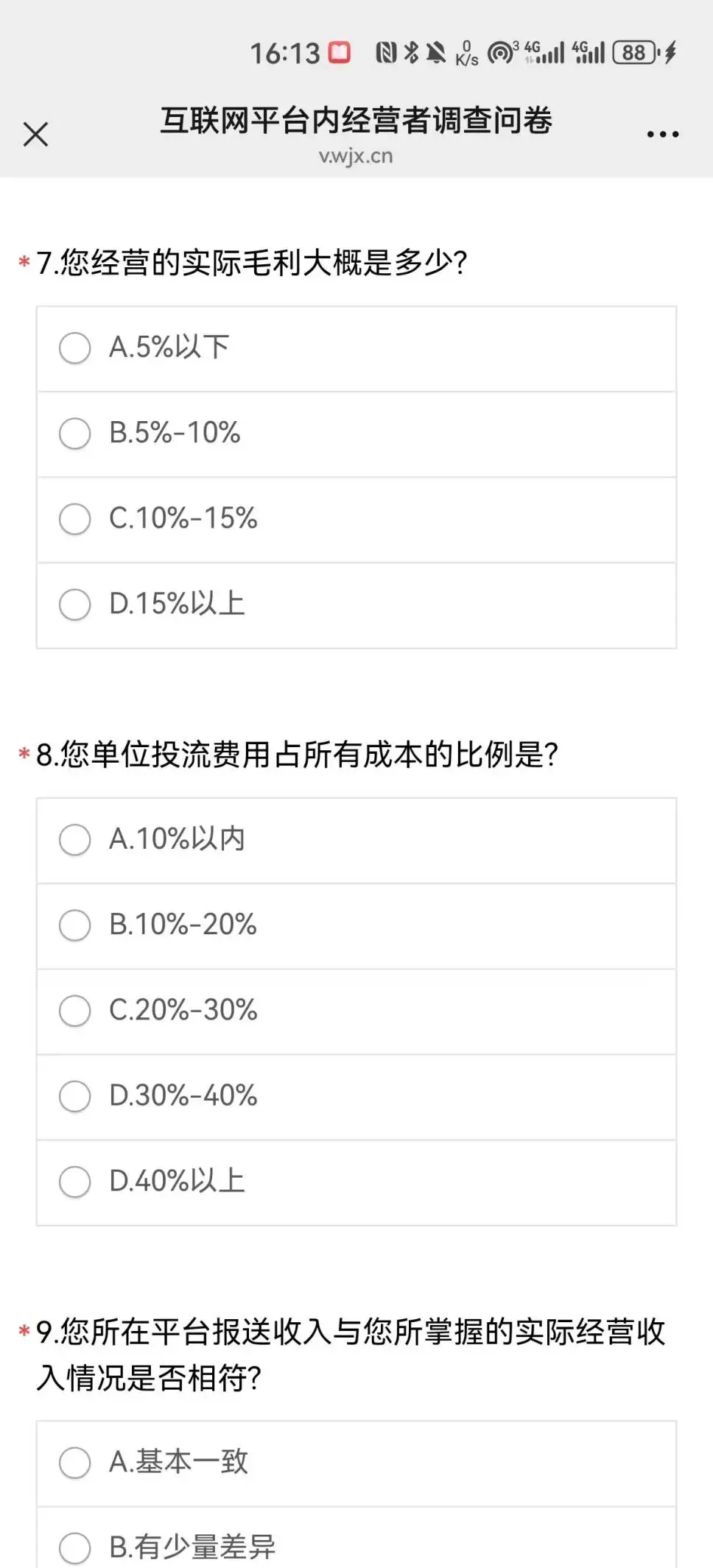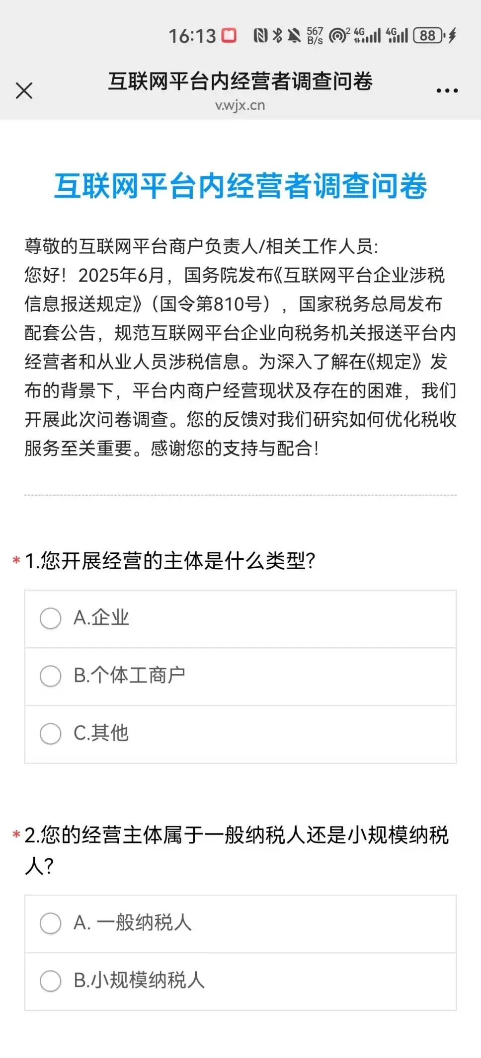 今日,有卖家爆料收到某地方税务发送的短信,针对平台经营者的调查问卷,了解经营的现状和困难。