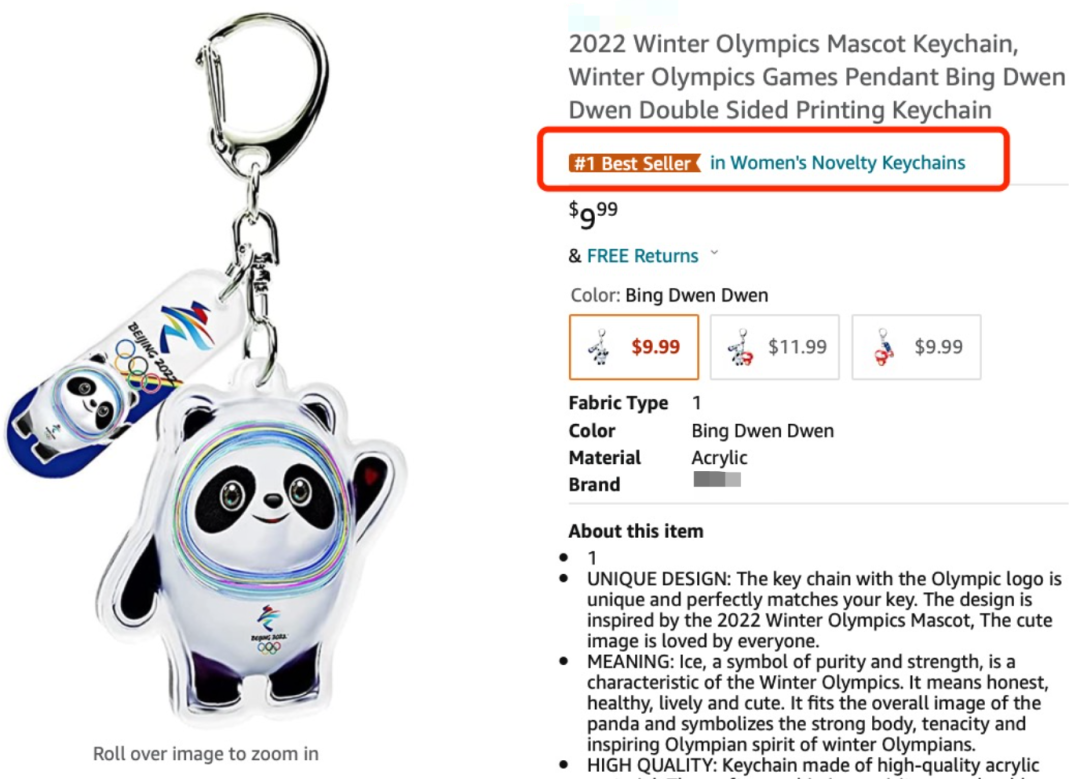 冬奥会未结束,加之国外社交媒体的推波助澜,相信冬奥会周边的热潮还会持续,但大家也要注意爆款暗藏的风险。亚马逊上Best Seller Rank的冰墩墩钥匙扣链接变了狗,有卖家推测应该是没有获得官方授权,侵犯了知识产权。