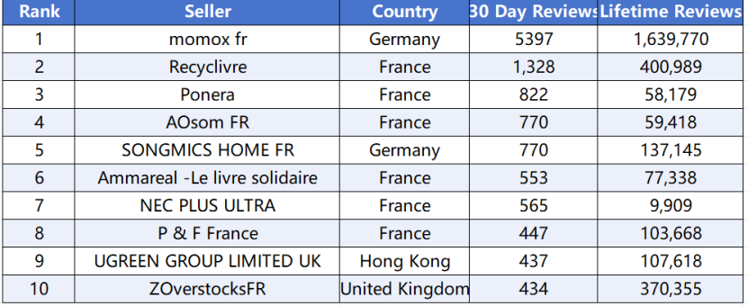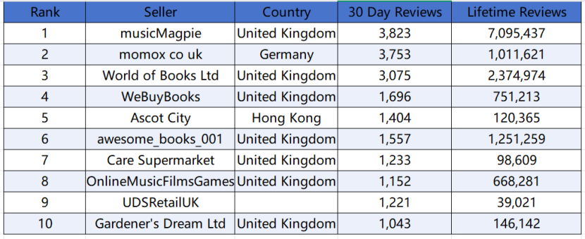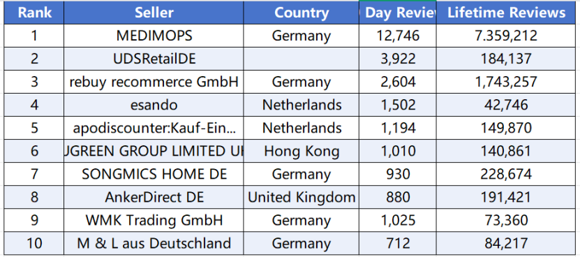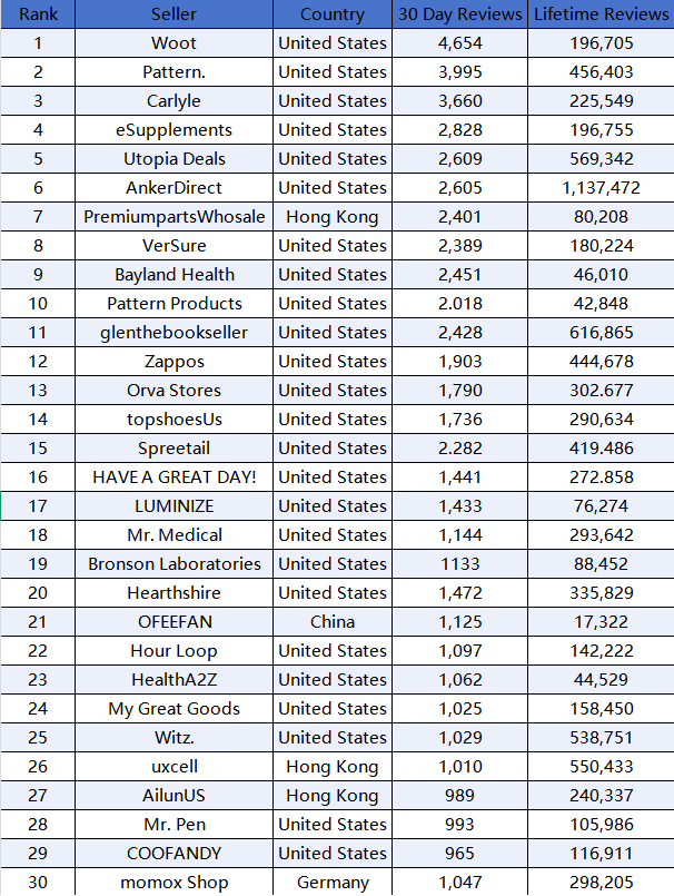 榜单是基于过去30天内卖家收到的积极评价数量来排名的。美国站榜单上的100位卖家中,有79位来自美国,17位来自中国大陆,3位来自中国香港,1位来自德国。